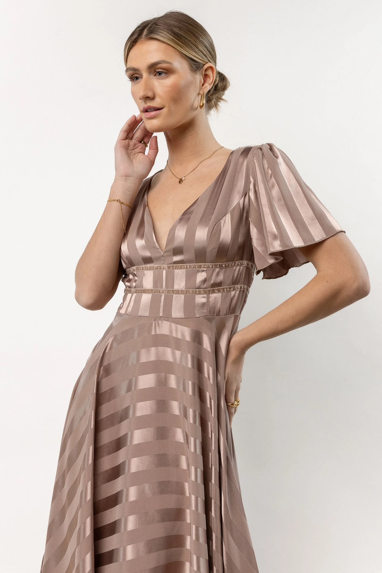 The Rylee Maxi Dress in Mauve is designed with a flattering fit and luxurious materials, making it perfect for special occasions. Enhanced with a velvet detail at the waistline and flutter sleeves, this dress is sure to turn heads.