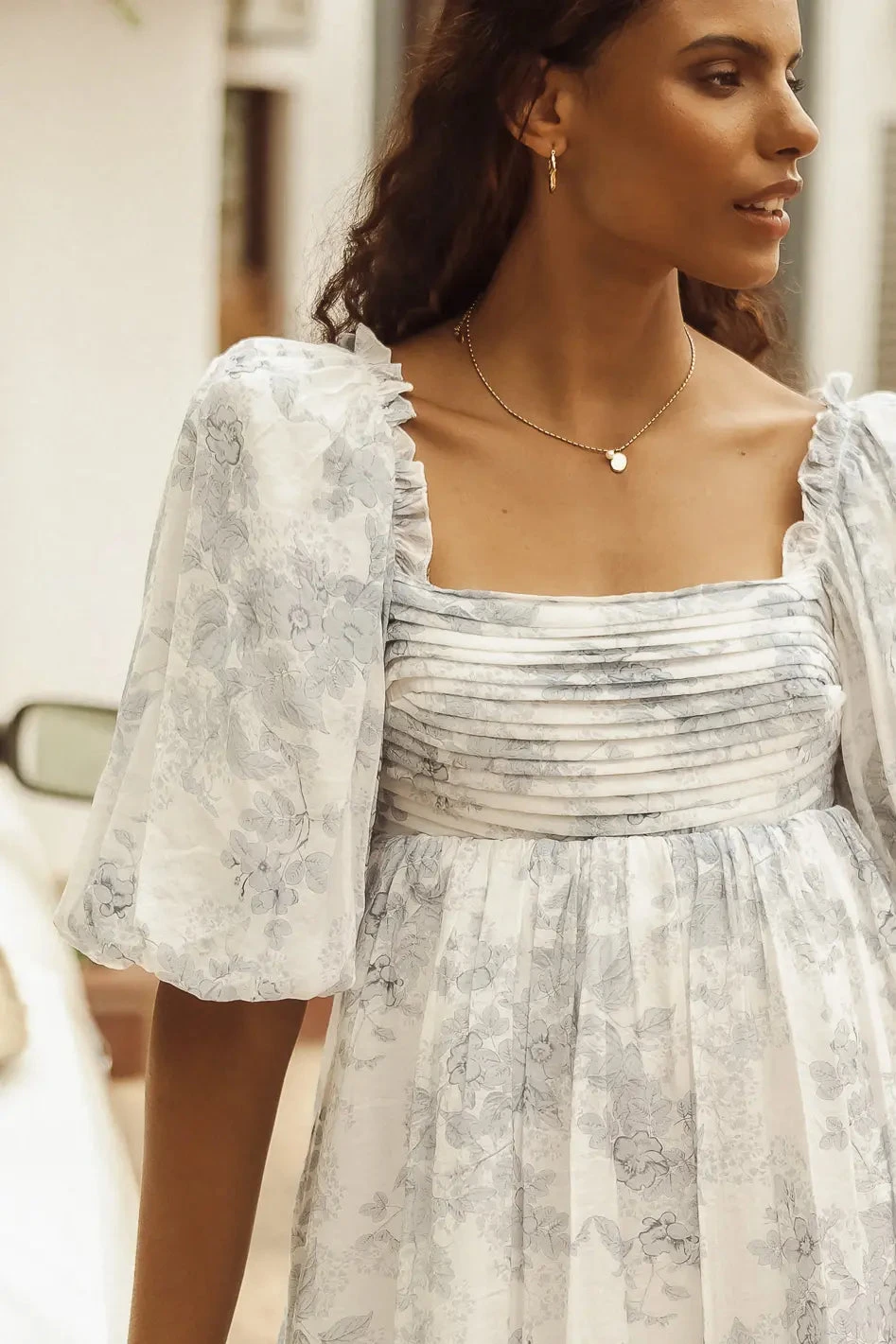 - Short Puffed Sleeves with Ruffle Detailing on Shoulders