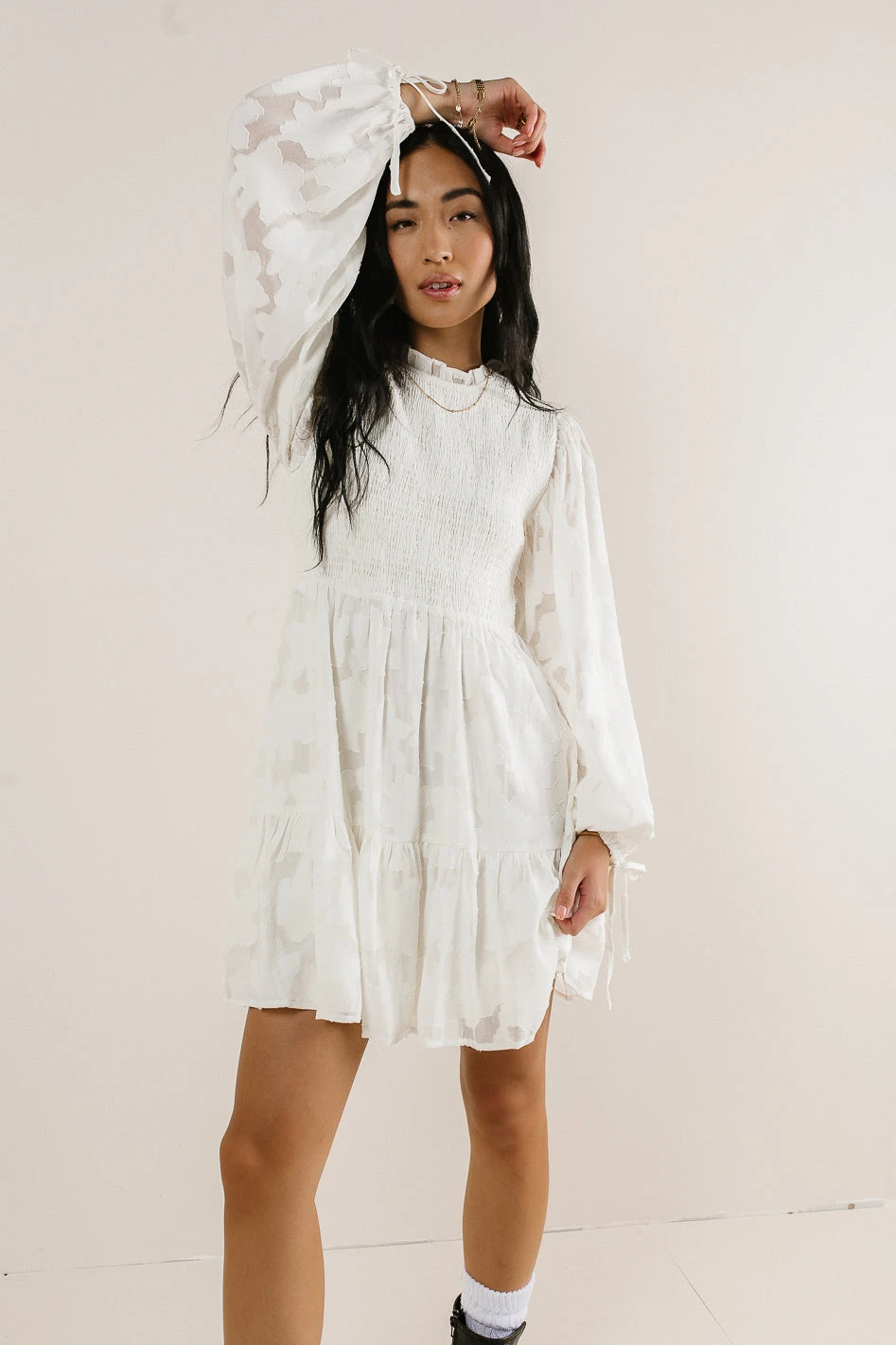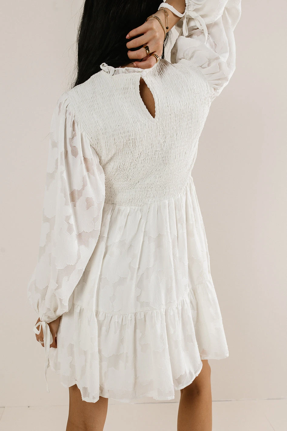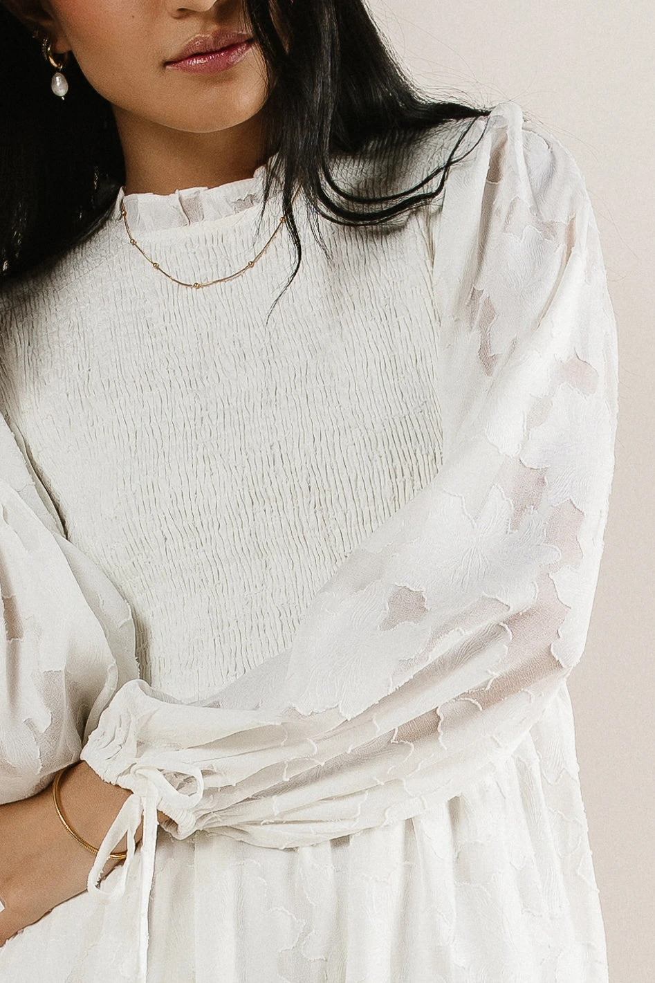 - Long Puff Sleeves with Elastic Cuffs and Tie Detail